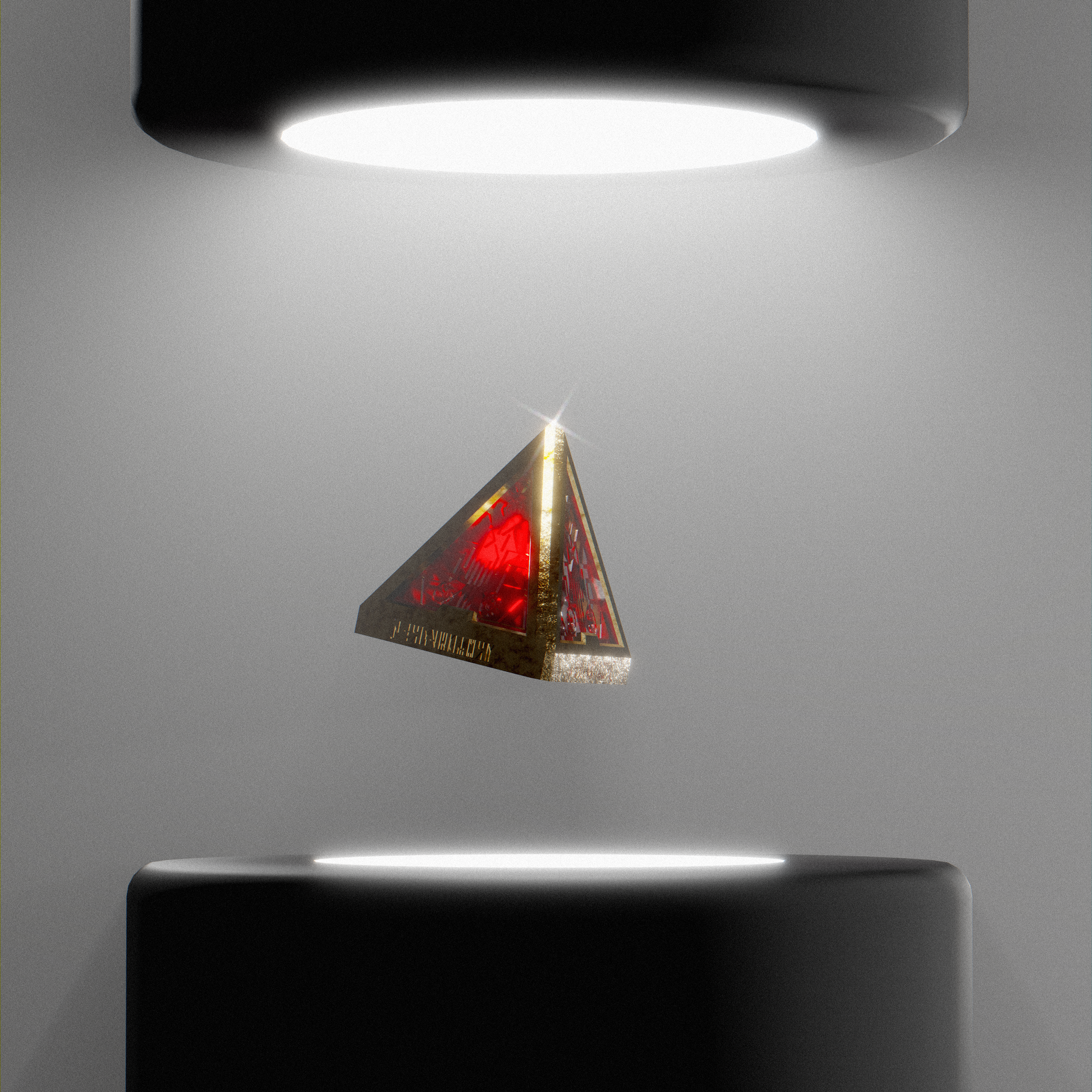 Auf den Seitenflächen befinden sich feine, mystische Gravuren – uralte Symbole, die an verschlüsselte Daten vergangener Sternenreiche erinnern. Das Zusammenspiel von rotem Kristallkörper, goldenen Akzenten und symbolischen Mustern erschafft ein Artefakt von außergewöhnlicher Tiefe und Bedeutung.